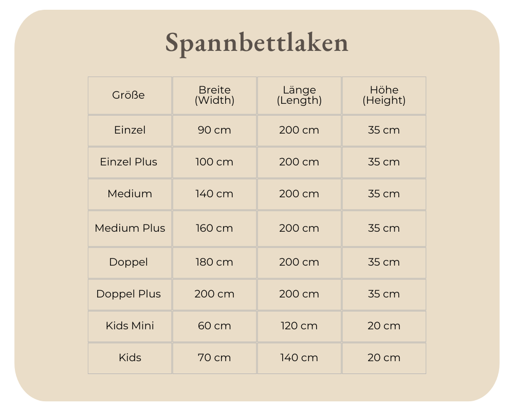 Unsere Spannbettlaken passen auf Matratzen mit einer Höhe von bis zu 35 cm. Dank des elastischen Rundum-Gummizugs sitzen sie straff und verrutschen nicht.