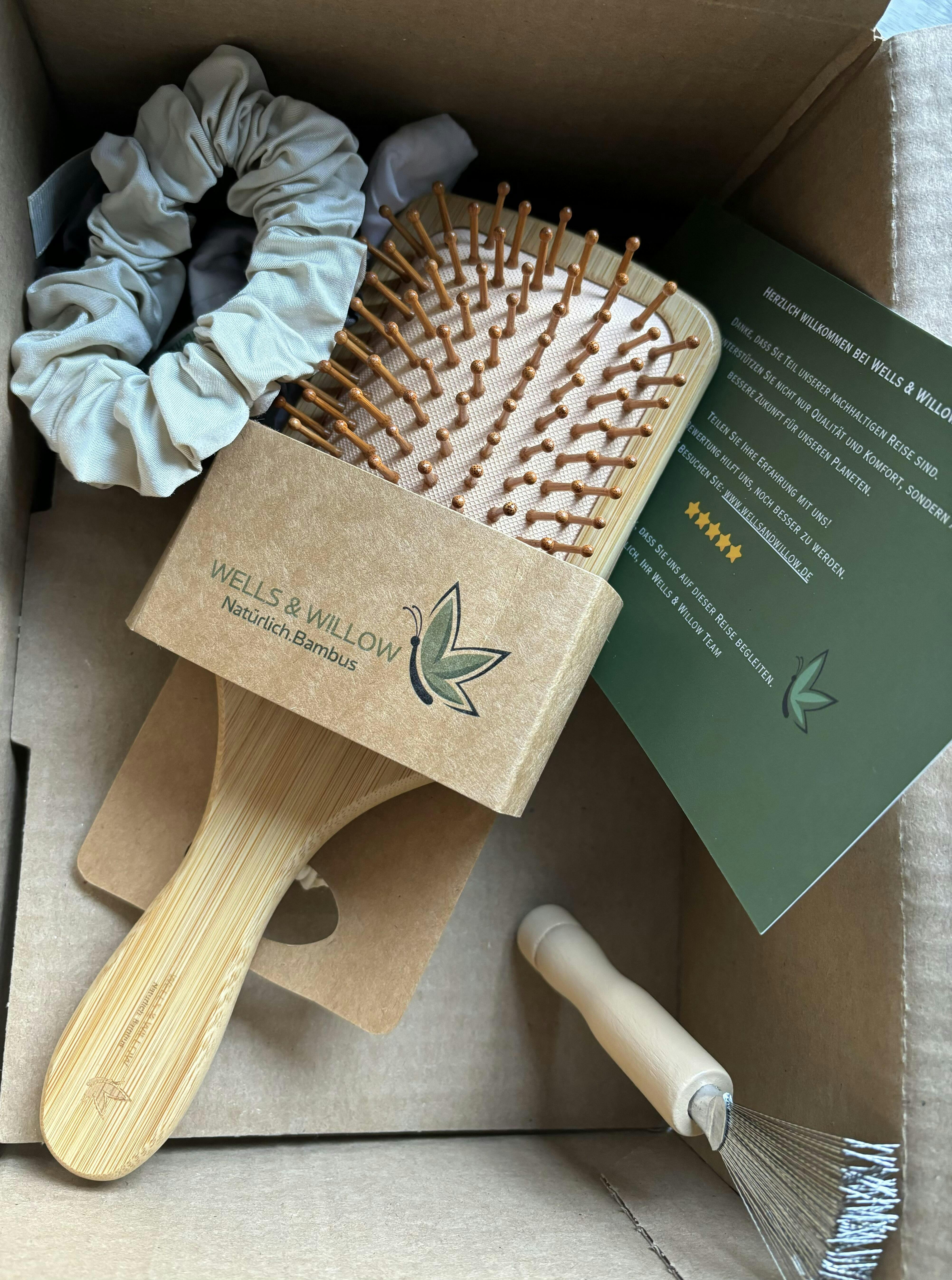 Inhalt: Bambus-Haarbürste, Reinigungswerkzeug aus Neemholz